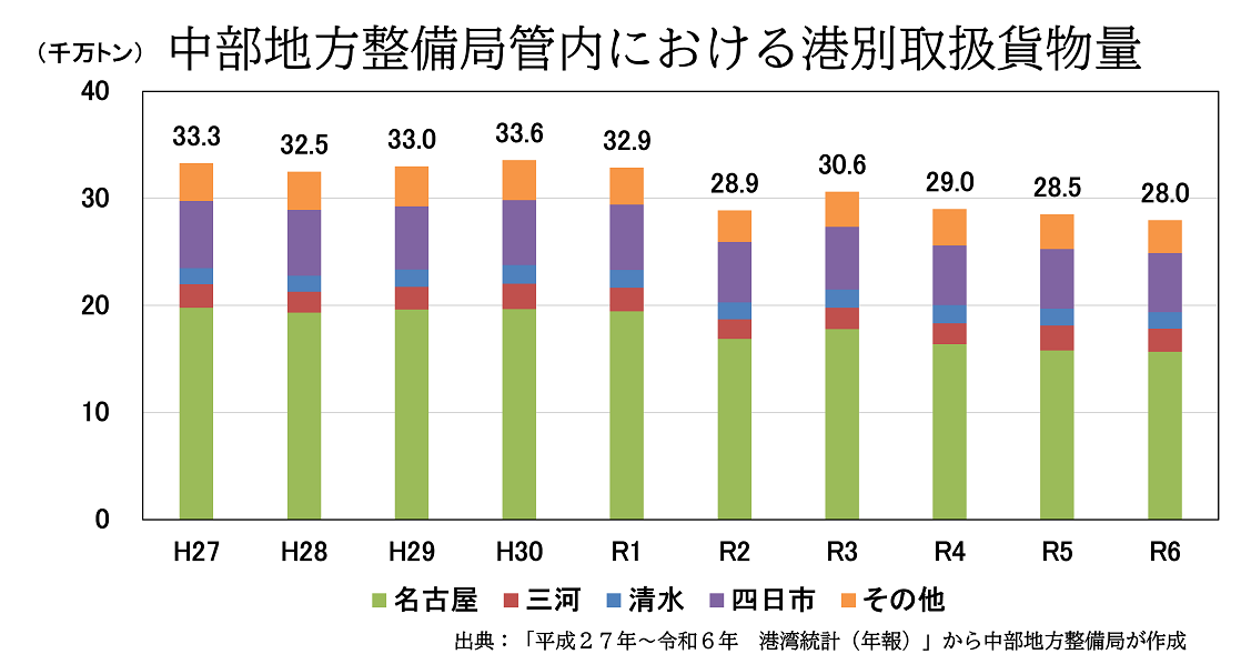 ・中部管内の取扱貨物量は、3億トン程度で推移している。 ・各港の占める割合について、大きな経年変化はない。